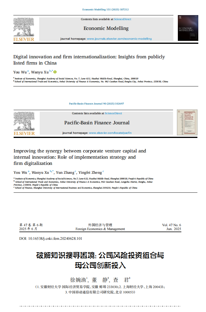 近日,学院徐婉渔博士以第一作者或通讯作者身份,在国际与国内权威期刊《Economic Modelling》《Pacific-Basin Finance Journal》《外国经济与管理》发表三篇学术论文,研究涵盖数字化创新、企业国际化战略及公司风险投资与内部创新的协同机制,成果显著。